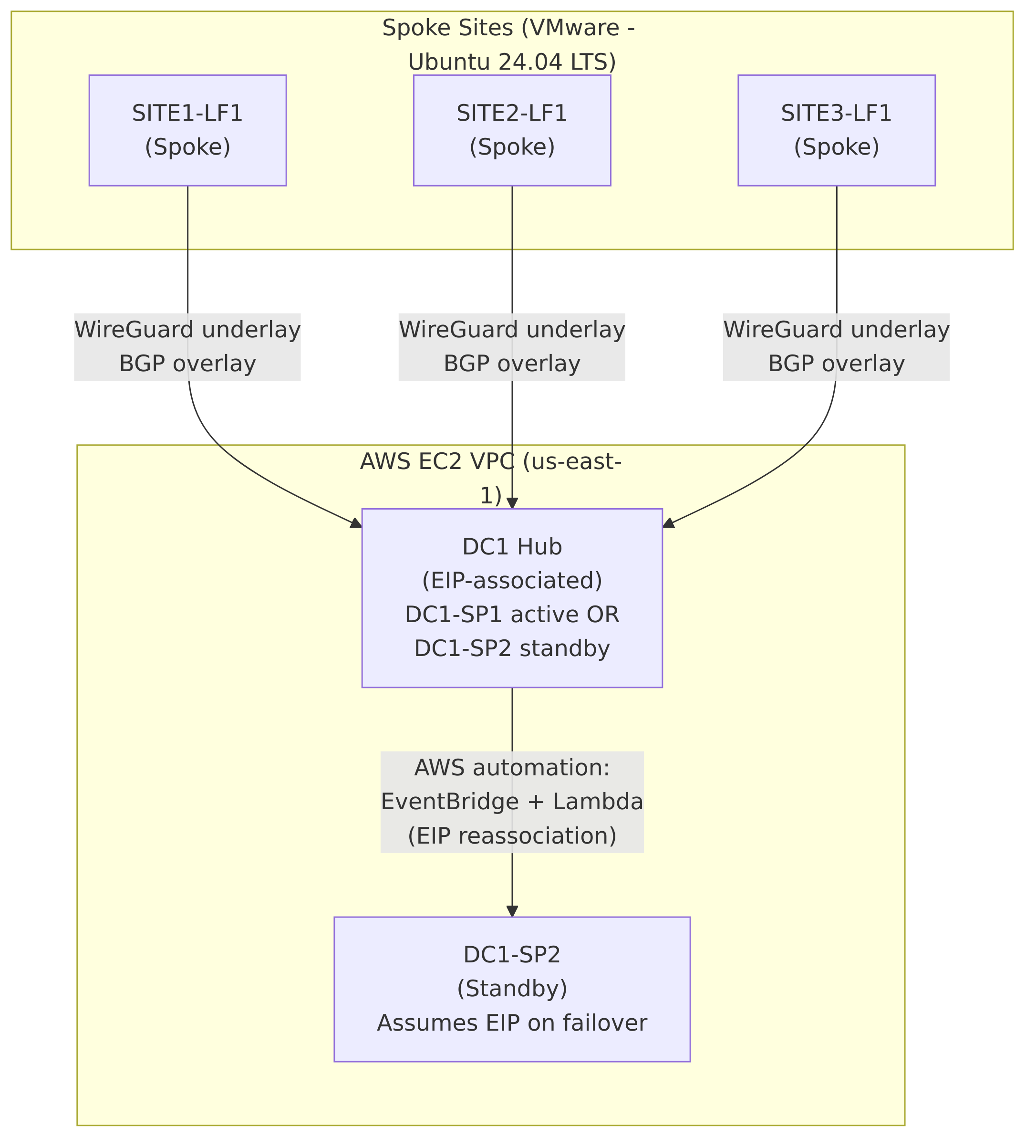 | Primary Technologies | WireGuard, BGP (FRR), AWS EC2, EventBridge, Lambda, CloudWatch |